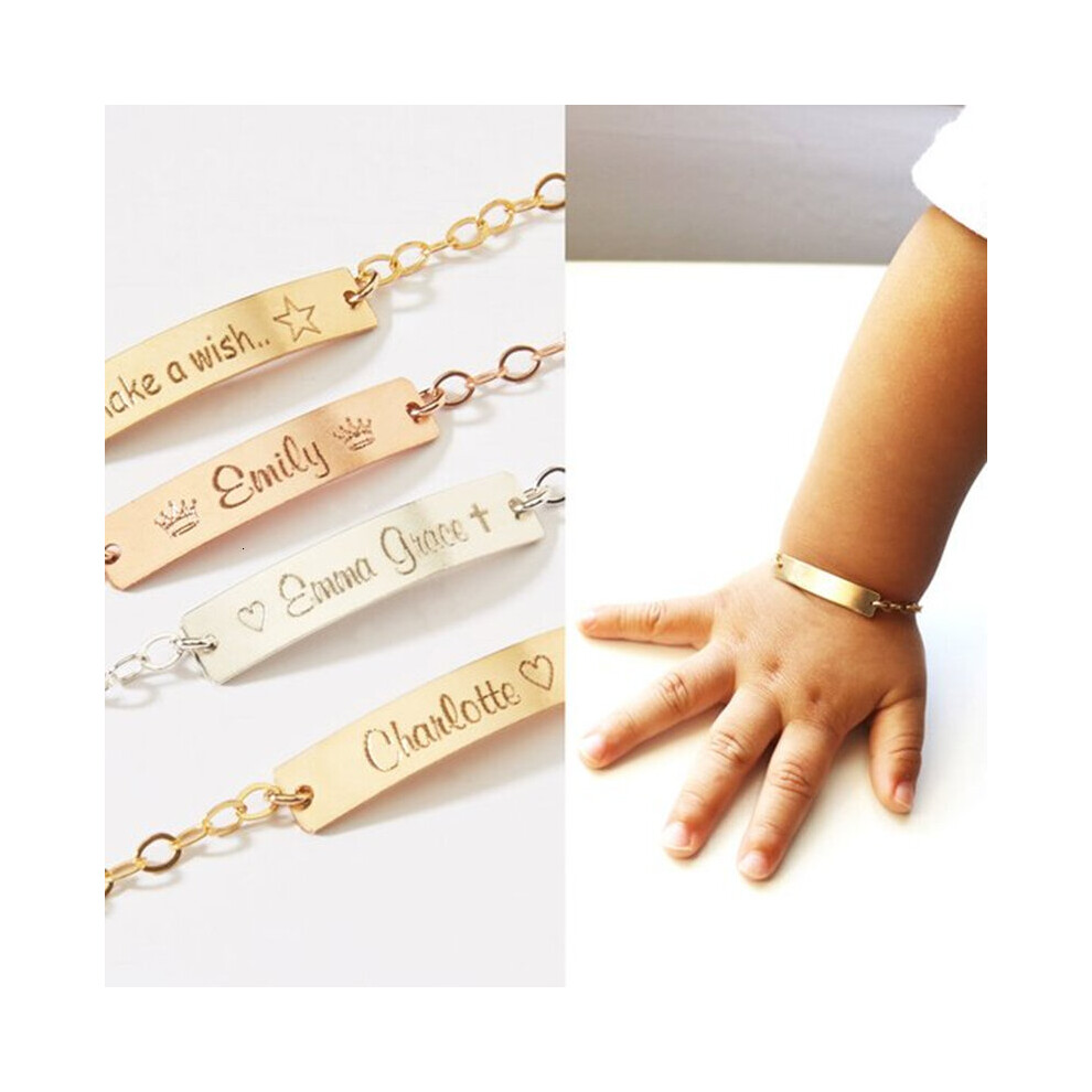 (Gold-color, 19cm) Personalized Baby Name Bracelet Toddler ID Year Date Bar Customed Bracelets For Kid Stainless Steel Jewelry Child Birthday