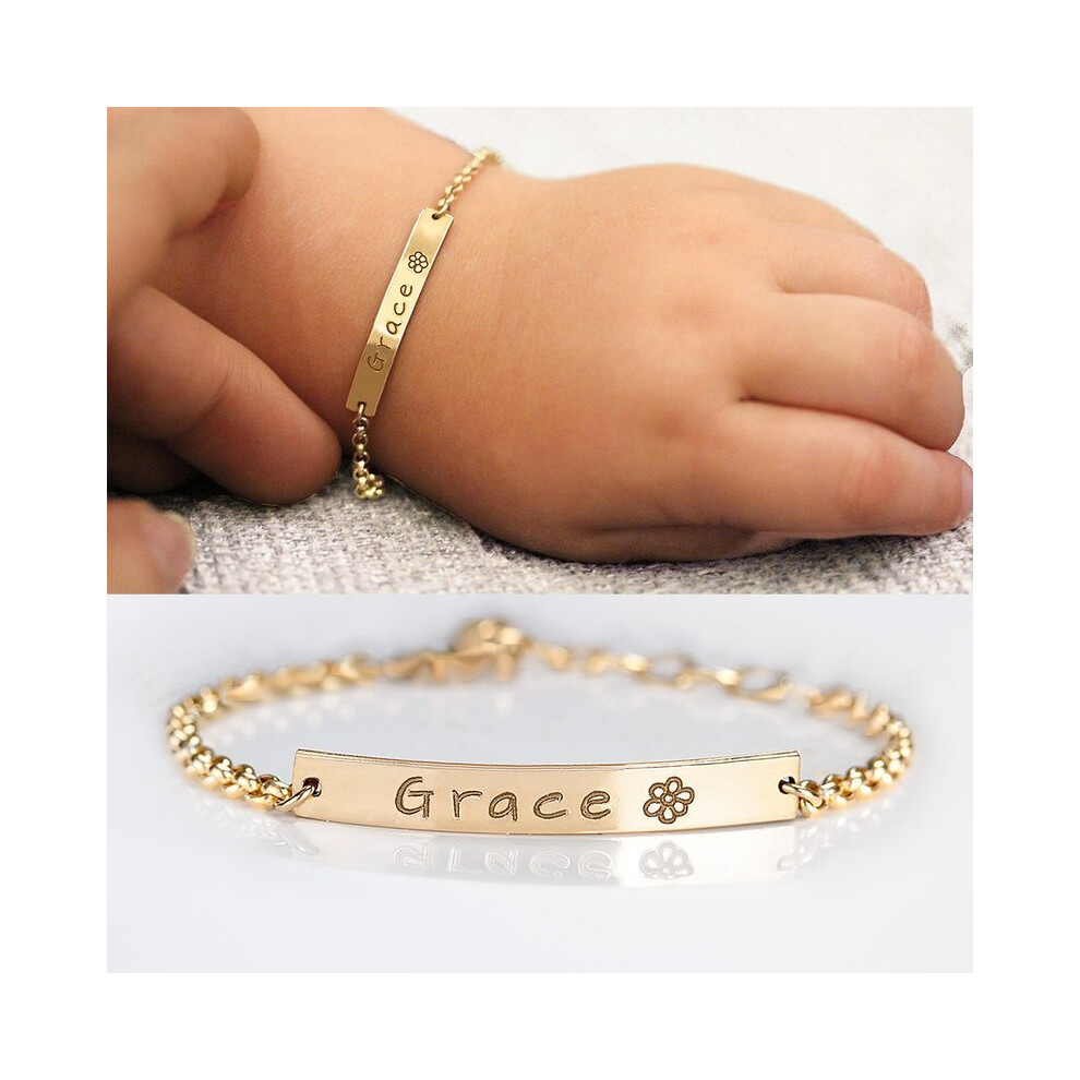 (Gold-color, 16cm) Personalized Baby Name Bracelet Toddler ID Year Date Bar Customed Bracelets For Kid Stainless Steel Jewelry Child Birthday