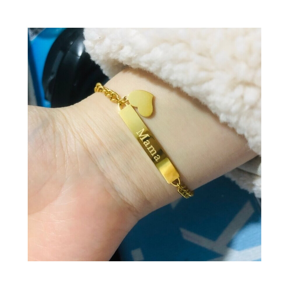 (Gold-color, 19cm) Baby Name Bracelet Long Bar Engraved Name Heart Cuban Chain Bracelets For Women Pulseras Personalized
