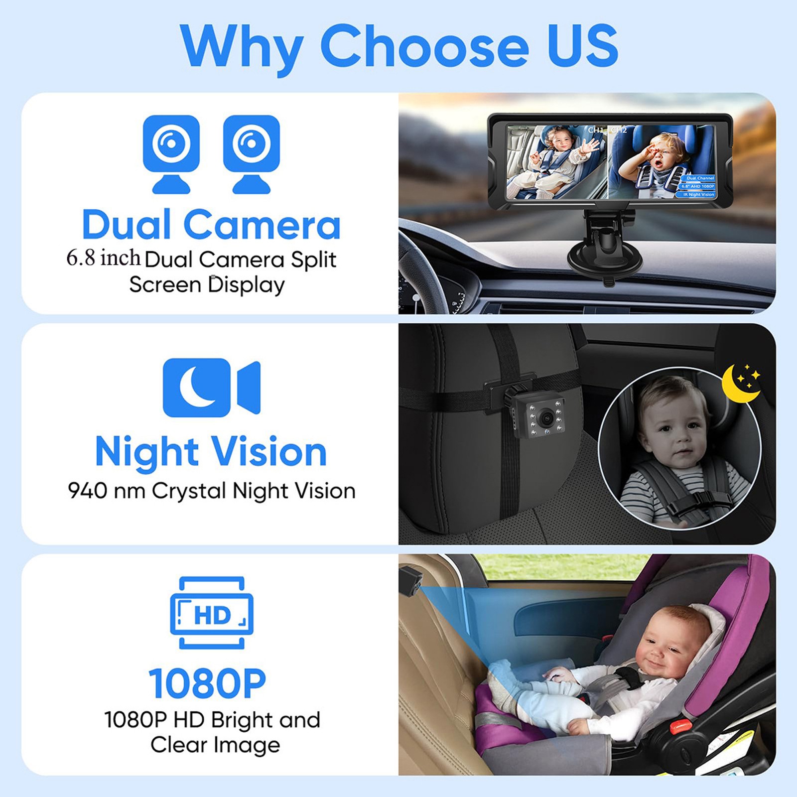 1-Baby Car Camera Dual Channel 6.8 Inch 1080P Baby Monitor With IR Night