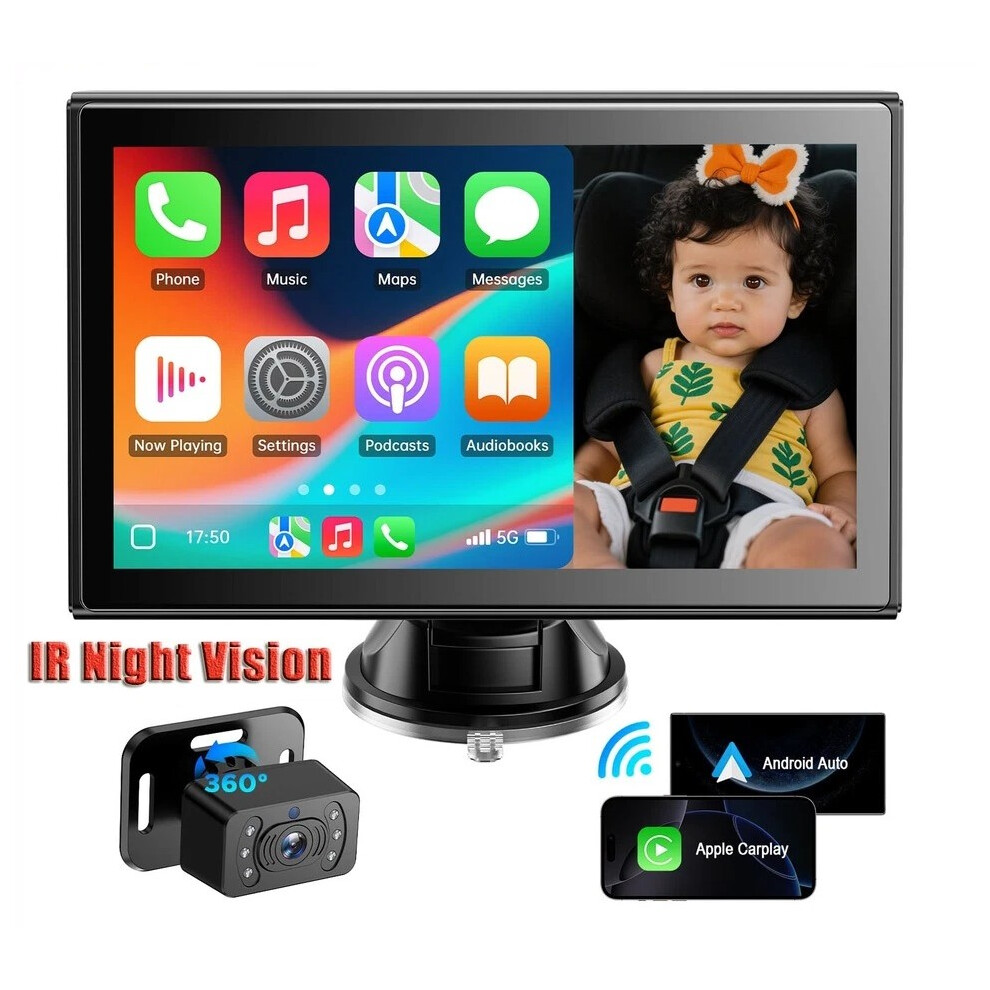 7" HD Baby Car Camera with Wireless CarPlay & Android Auto 1080P Rear Seat Monitor, Night Vision, Split-Screen Display