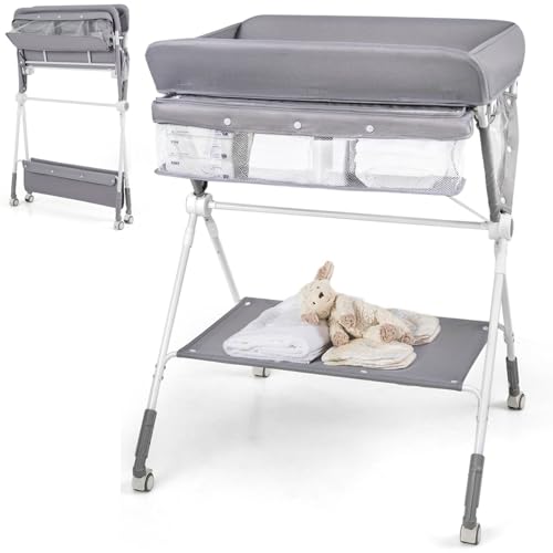 Maxmass Baby Changing Table, Folding Infant Diaper Changing Station with Wheels, Shelf and Storage Basket, Height Adjustable Nappy Table for Newborn (Gray)