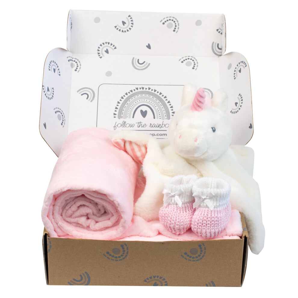 Baby Box Shop - 4 Baby Essentials for Newborn Baby Girl, Ideal as Baby Shower Gifts & Christening Gifts for Girls, Includes a Unicorn Baby Comforter,