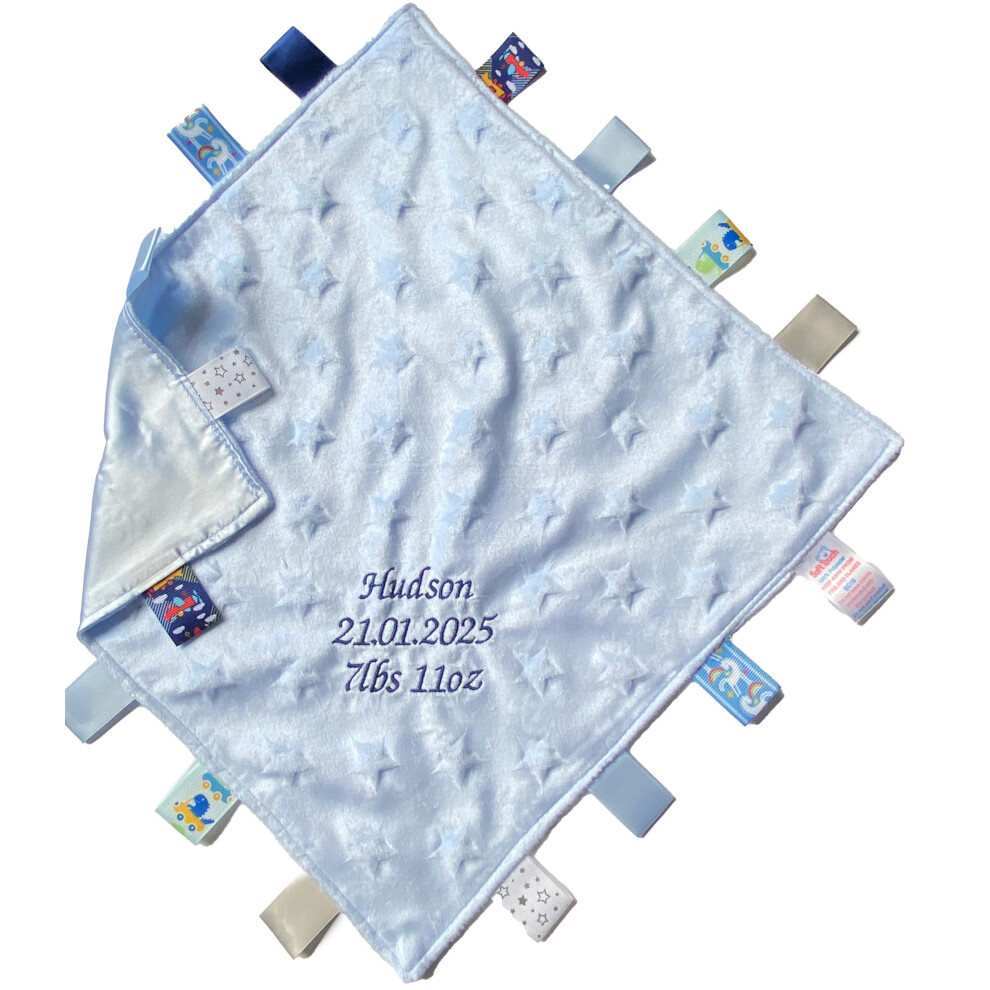 Personalised Baby Comforter Taggy Comfort Blanket Birth Stats Newborn Gift Present (Blue Star Design)