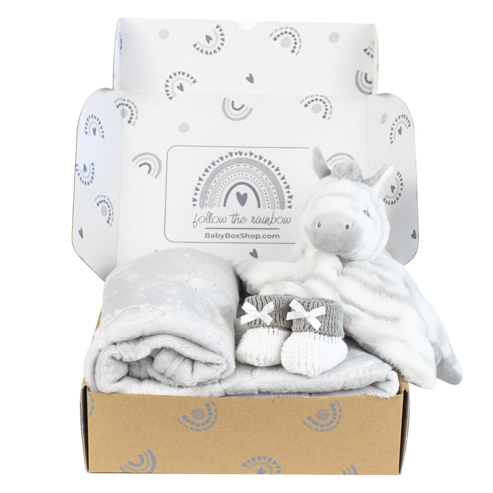 Baby Box Shop - 4 Baby Essentials for Newborn Unisex, Ideal as Baby Shower Gifts & Christening Gifts, Includes a Zebra Baby Comforter, Grey Fleece