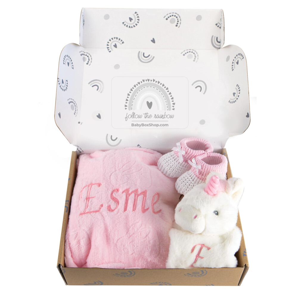 Baby Box Shop - Personalised Baby Girl Gifts - Personalised Baby Blanket & Unicorn Baby Comforter with Pink Cotton Booties, Ideal as Christening Gift