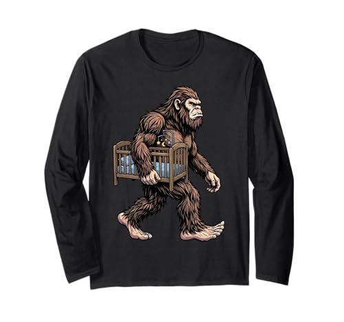 Bigfoot Carrying Baby Crib Funny Sasquatch Parenting Humor Long Sleeve T-Shirt