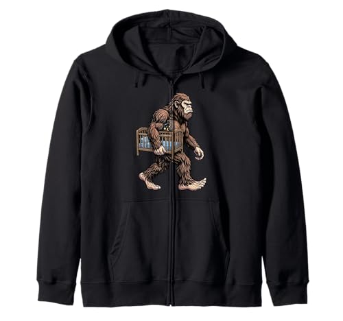 Bigfoot Carrying Baby Crib Funny Sasquatch Parenting Humor Zip Hoodie