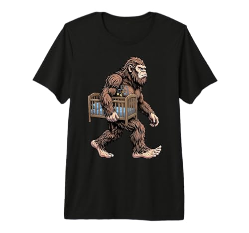 Bigfoot Carrying Baby Crib Funny Sasquatch Parenting Humor Premium T-Shirt