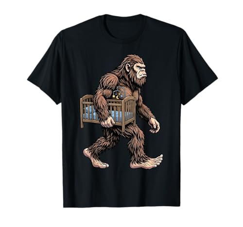 Bigfoot Carrying Baby Crib Funny Sasquatch Parenting Humor T-Shirt