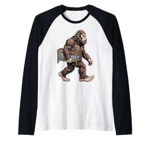 Bigfoot Carrying Baby Crib Funny Sasquatch Parenting Humor Raglan Baseball Tee