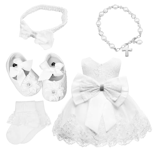 YFNVH 5 Pcs Baby Girl Christening Dress White Lace Dress Gown Set for Toddler 6-12 Months Wedding Party Baptism Outfit with Bowknot Headwear Cross Charm Bracelet Socks Shoes