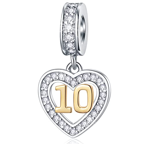 10 Years Old Birthday Charms fit Pandora DIY Bracelet, 18K Gold Number 10 Dangle, 925 Sterling Silver 10th Wedding Anniversary Pendant Beads with CZ, Gifts for Daughter/Son/Baby Girl/Boy