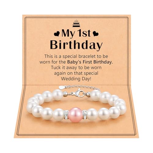 1st Birthday Gifts for Girls, Adjustable Pearl Bracelet for 1 Year Old Girl, Adjustable Baby Bracelet for Girls with Message Card, Daughter Granddaughter Niece First Birthday Gifts (Pink White)