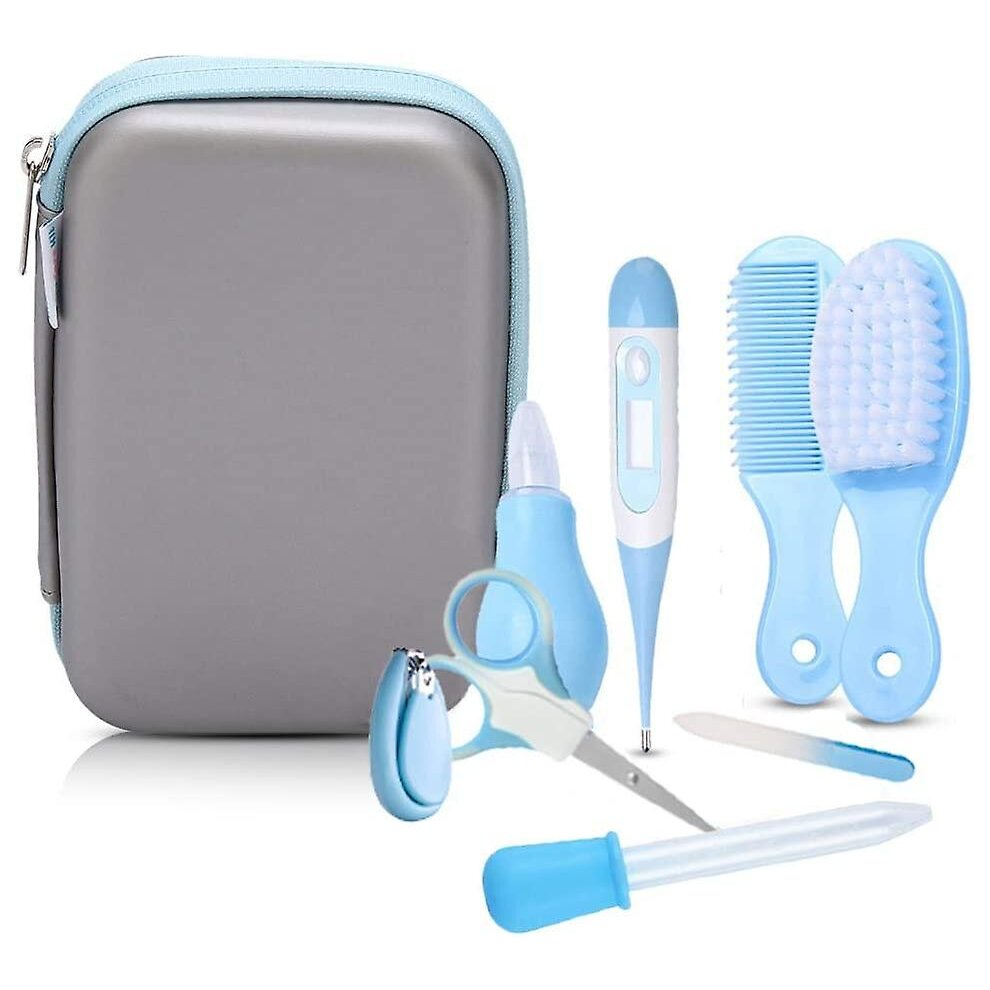 (Blue, One size) 9Pcs Baby Grooming Health Care Kit Nail Clipper Brush Comb Scissors File Thermometer Nasal Aspirator Finger Toothbrush