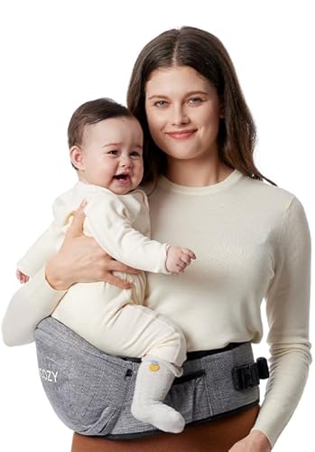 Momcozy CPC-Certified Baby Hip Carrier - Adjustable Waistband with Original 3D Belly Protector, Ergonomic Carrier with Various Pockets for Newborns & Toddlers up to 45lbs (Grey, Medium)