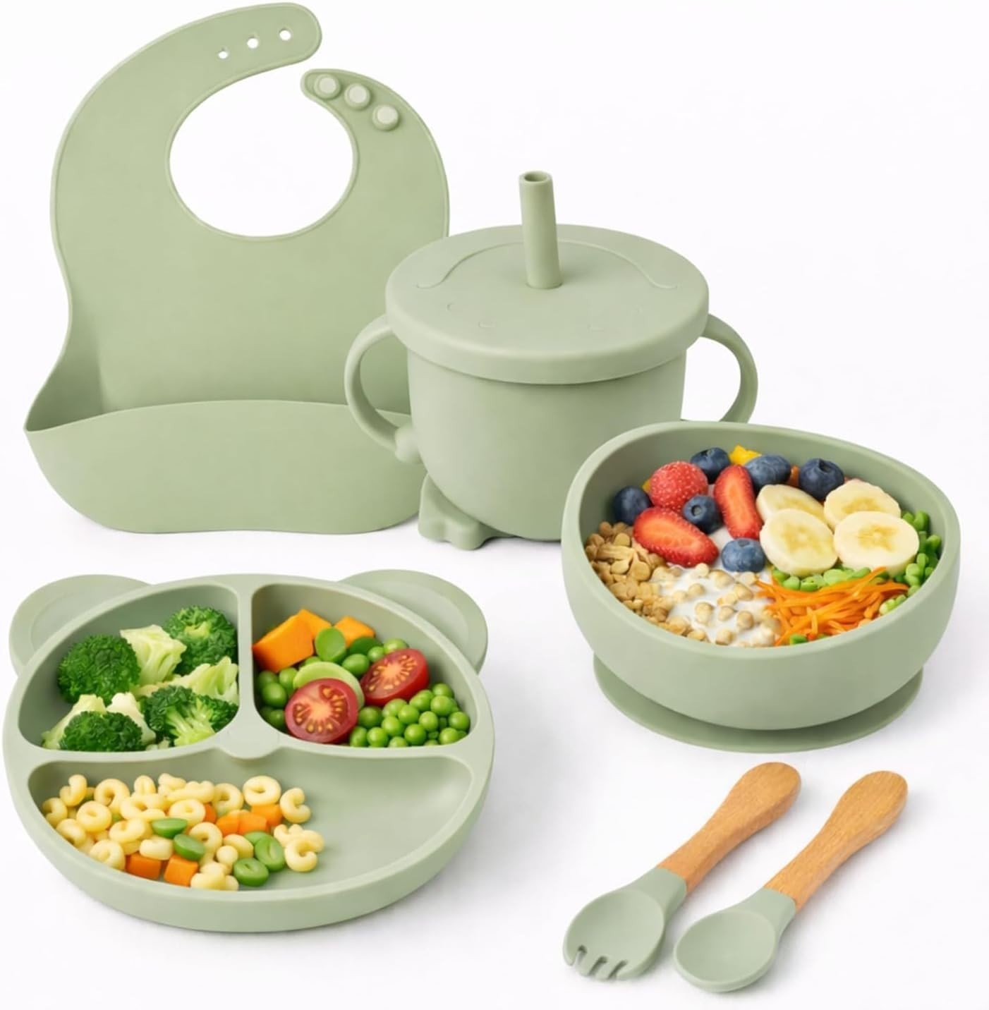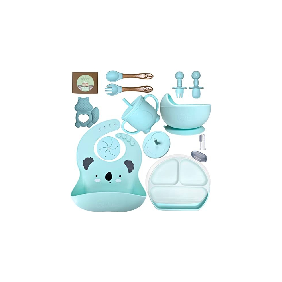 O'doe 11-Piece Baby Weaning Set | Baby Led Weaning Feeding Supplies for Toddlers | Baby Feeding Set with BPA-Free Suction Bowl, Silicone Baby Feeding Set, Spoons, Bibs, and Food Plate Kit | Green V1