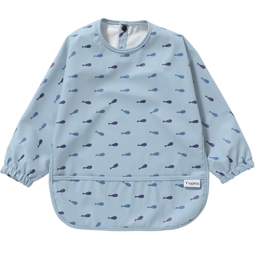 Yiupea Baby Weaning Bib Mess Proof with Long Sleeves - Machine Washable & Waterproof Bibs 6-24 Months for Baby Led Weaning, Coverall Bibs for Feeding-Blue