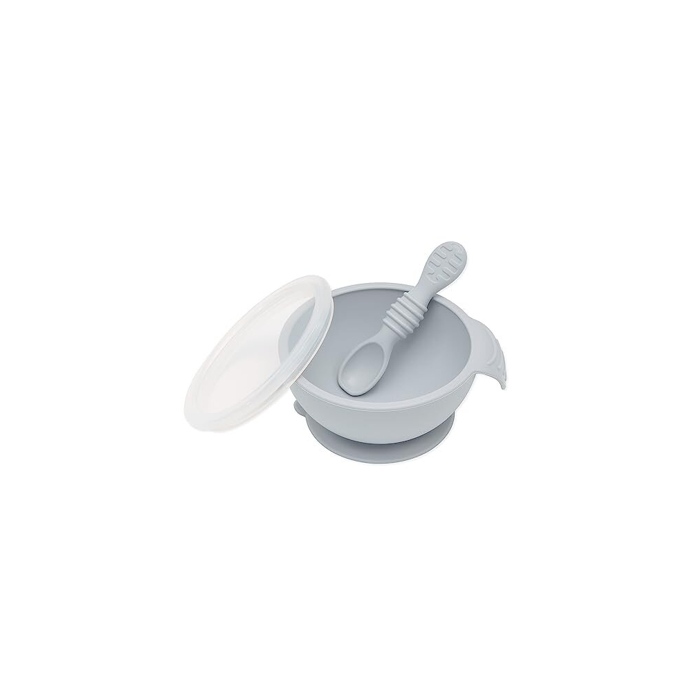 First Feeding Set - Bowl With Suction Base, Lid, Spoon, Baby Led Weaning, BPA-Free, Microwave/Dishwasher/Freezer Safe, 100% Silicone, Grey
