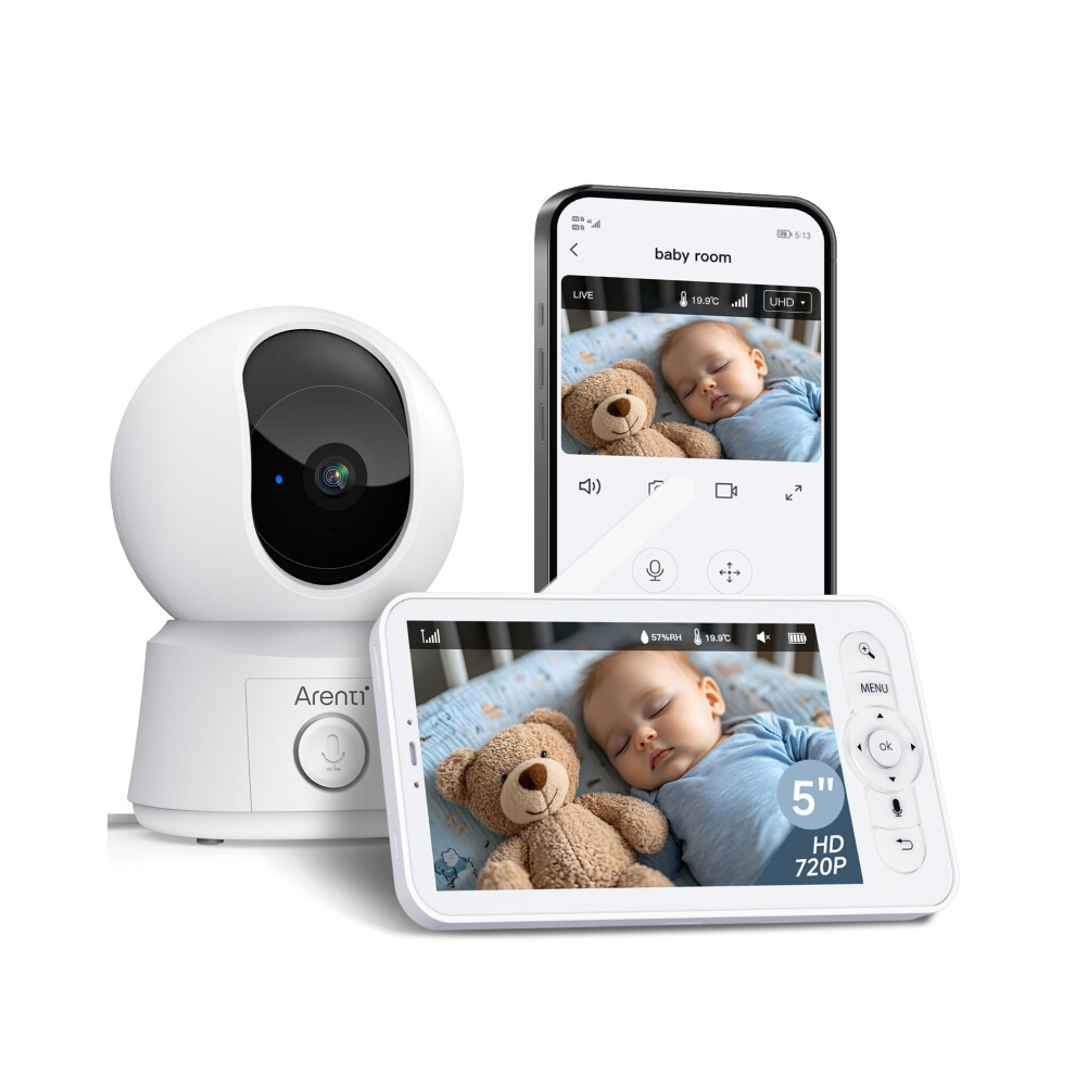 ARENTI 5'' 1080P Wi-fi Baby Monitor with Camera and App,Night Vision,720P Display,Remote Pan Tilt,HD Camera,Auto Tracking,300m Long Range,Temperature