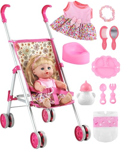 GAGAKU Baby Doll Pram Set with 30cm Doll & Accessories, Dolls Pushchair Stroller for Girls Ages 1 2 3 4 5 6+ Years, Foldable Toy Dolls Buggy for Kids