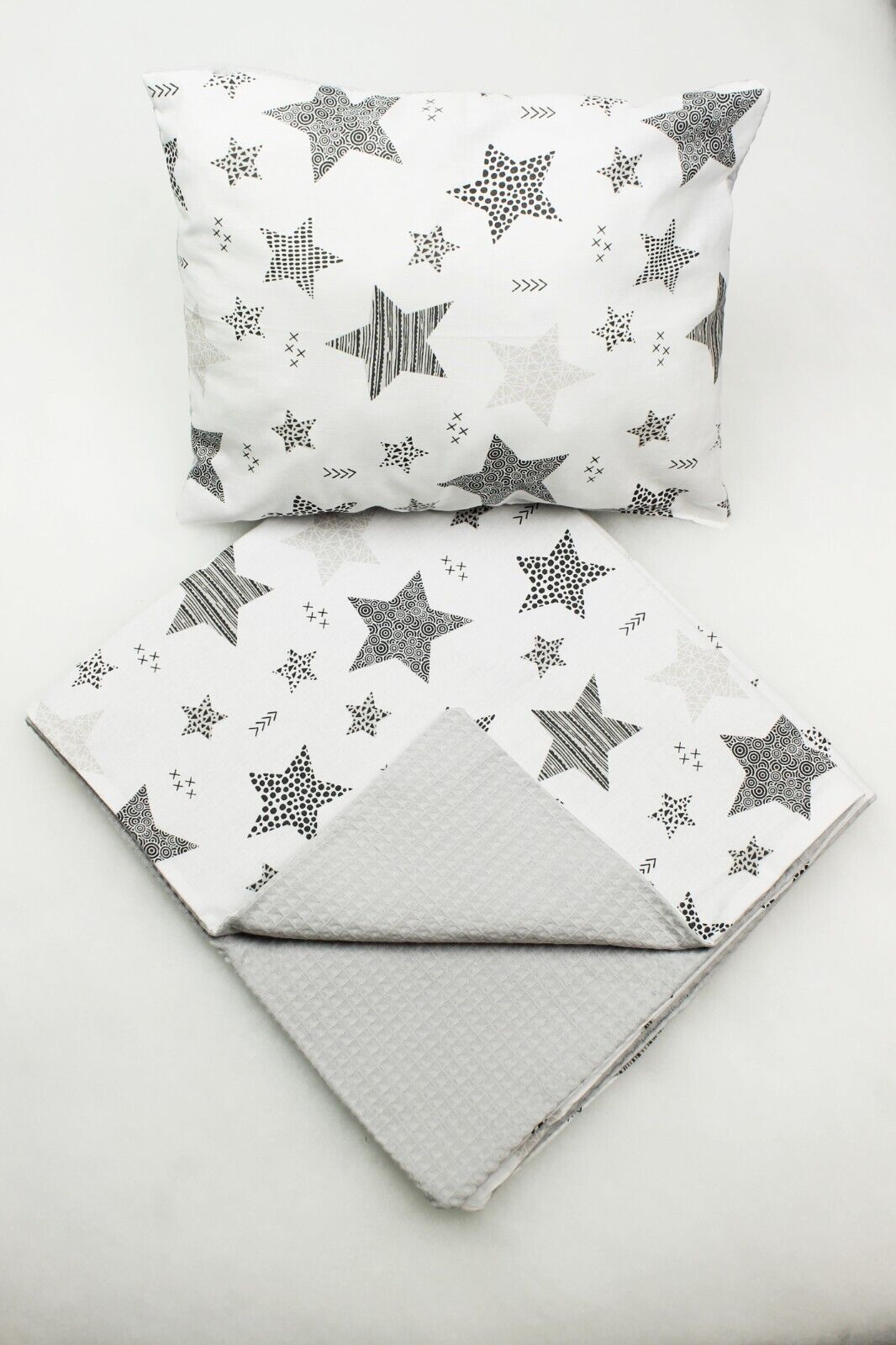 2pc baby blanket set for bedside crib pram cradle GREY WHITE STARS waffle cotton