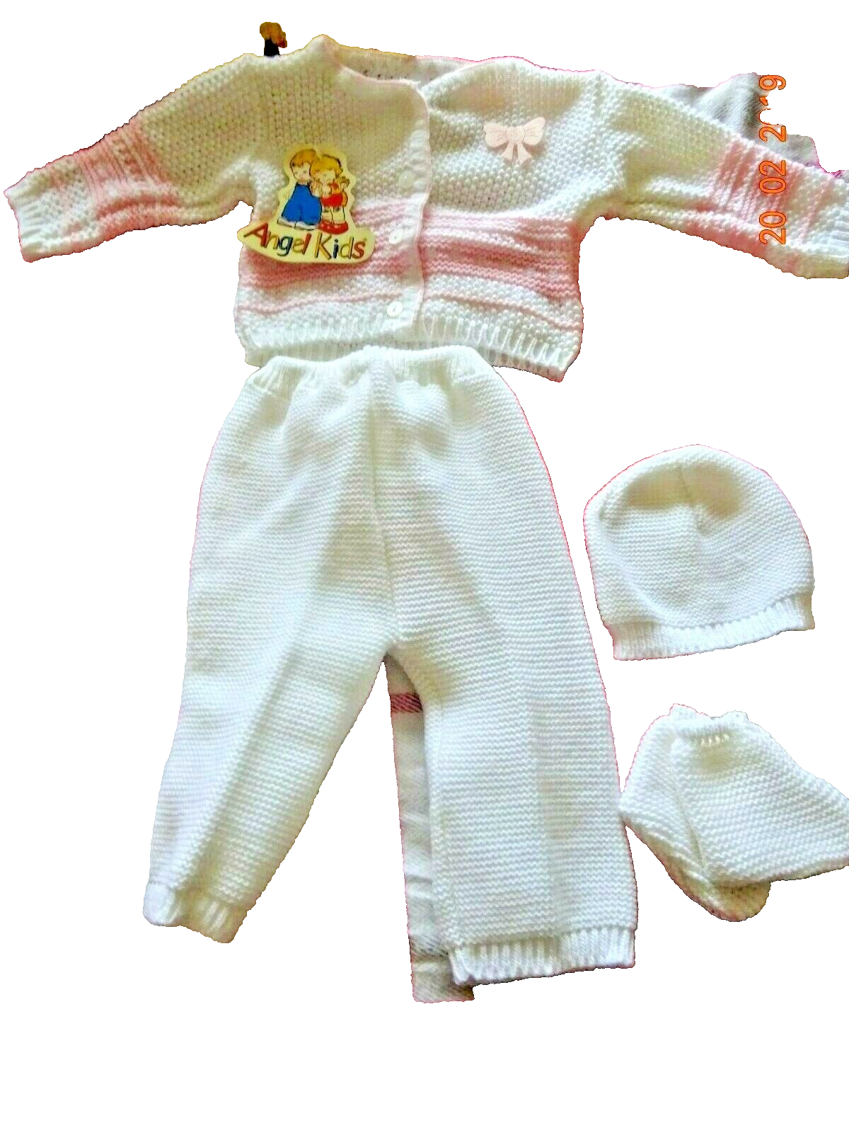 BABY GIRL 4 PIECE GIFT PRAM SET WHITE PINK, KNITTED CARDIGAN, PANTS, BOOTIES,HAT