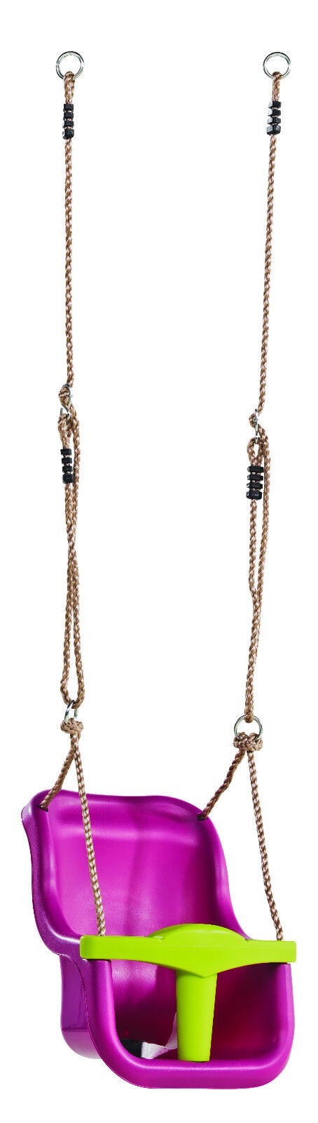 PURPLE/LIME GREEN HIGH BACK BABY SWING SEAT WITH 3 ATTACHMENT POINTS T-BAR -BNIB