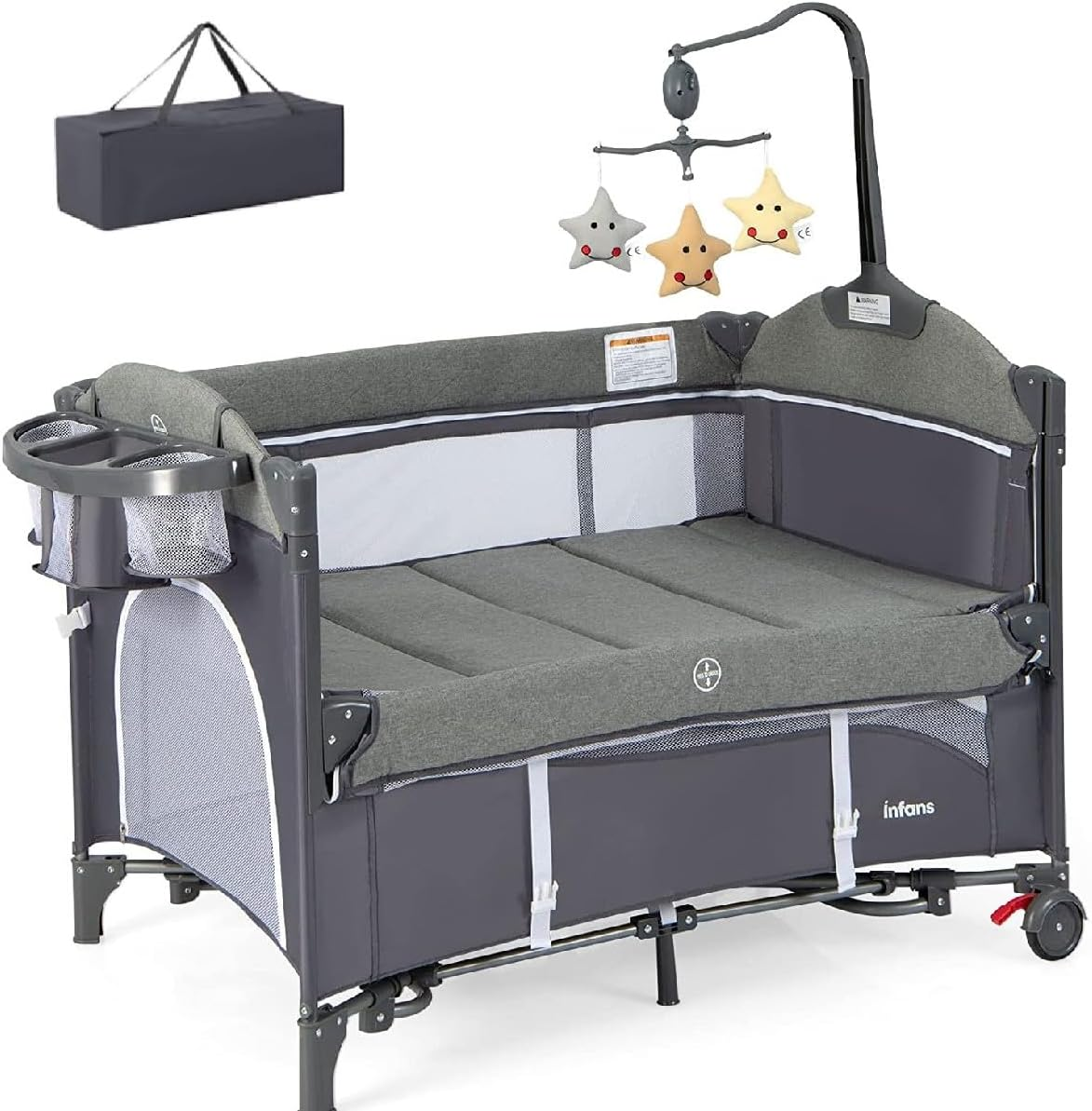 Maxmass 2-in-1 Baby Travel Cot, Portable Newborn Crib with Lockable Wheels, Removable Mattress and Carry Bag, Folding Infant Bedside Bed for Babies Toddlers (Grey)