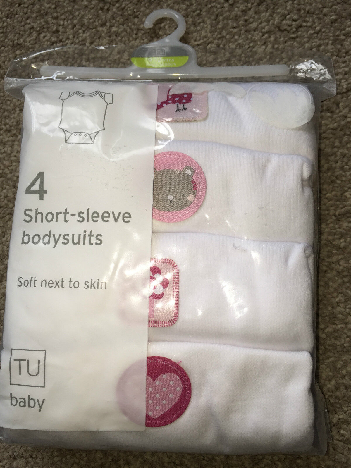 TU 4 X SHORT SLEEVE WHITE BABY BODYSUIT 9-12 MONTHS BIRD CAT FLOWER HEART SOFT
