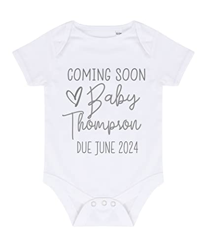 Personalised pregnancy baby announcement coming soon surname and due date [BBY3] baby grow vest, 0-3 months, White