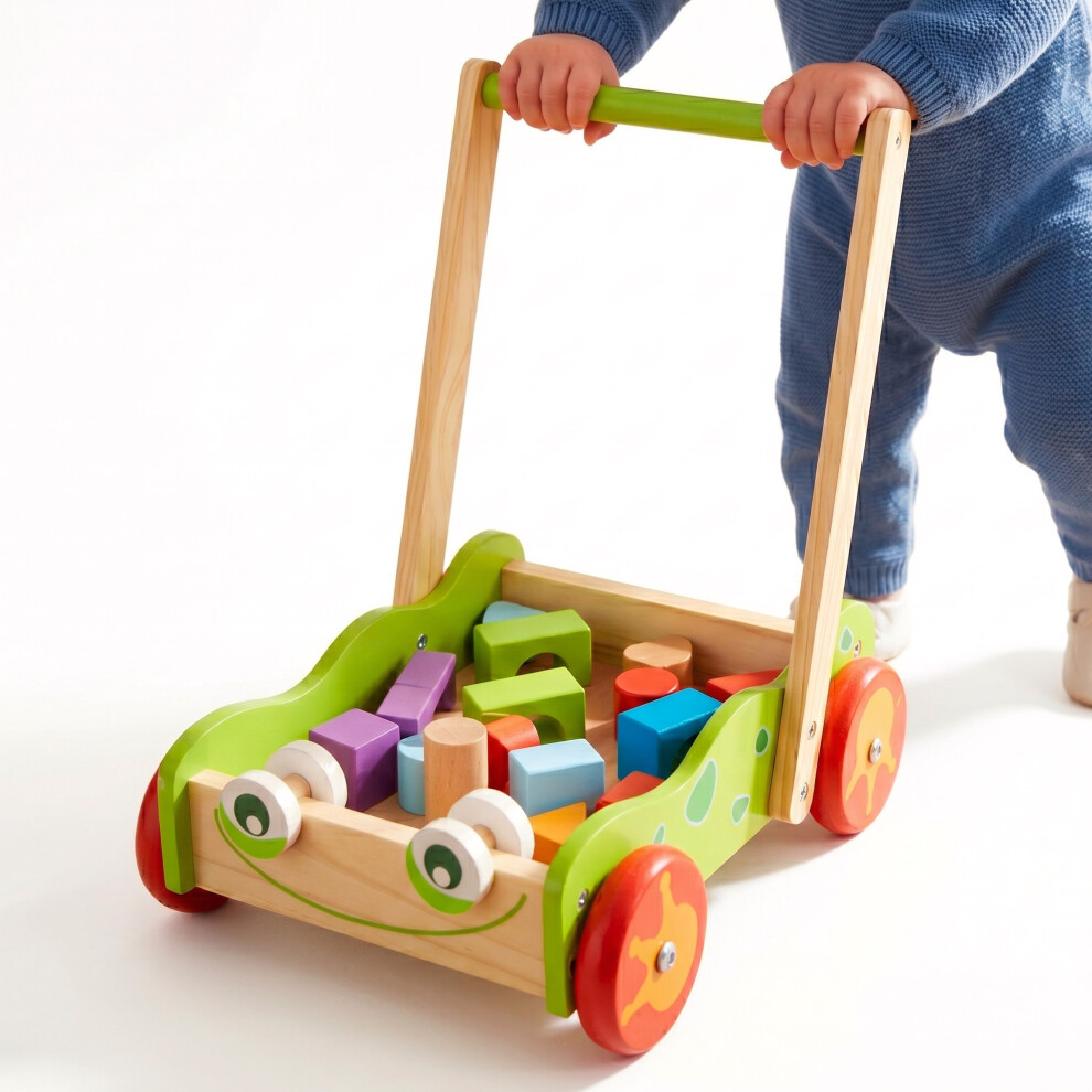 The Magic Toy Shop Baby Wooden Walker with Wooden Bricks Blocks Toddler Educational Toy
