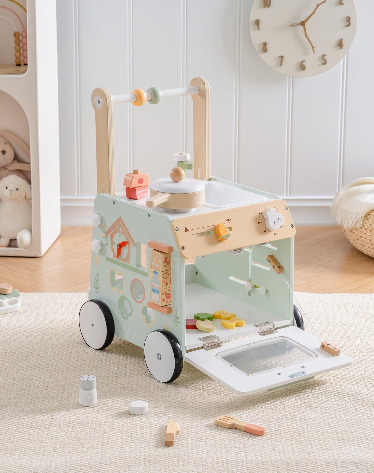 Wooden Baby Walker Toy with Kitchen Play Set, 2-in-1 Activity Center