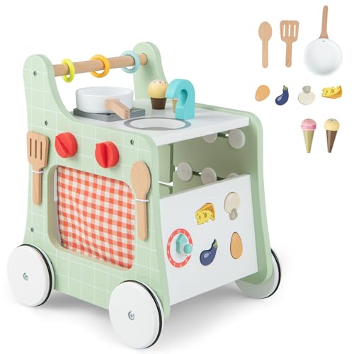 COSTWAY 6-in-1 Wooden Baby Walker, Toddler Push and Pull Learning Activity Center with Wheels, Teaching Clock, Shape Matching & Movable Slider, Pretend Play Kitchen for 12 Months + (Green)