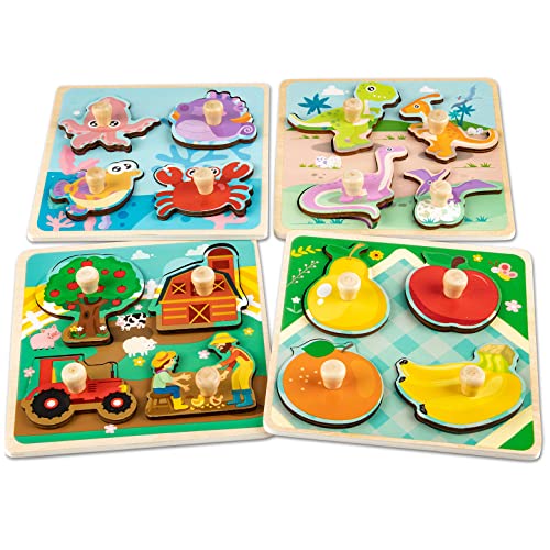 Funsland Wooden Puzzles Jigsaw for 1 Year Old, 4 Pcs Toddler Peg Puzzles Animals, Baby Montessori Wooden Toys, Infant Kid Fine Motor Skill Learning Educational Toys Gifts for 1 2 3 Years Old Kids