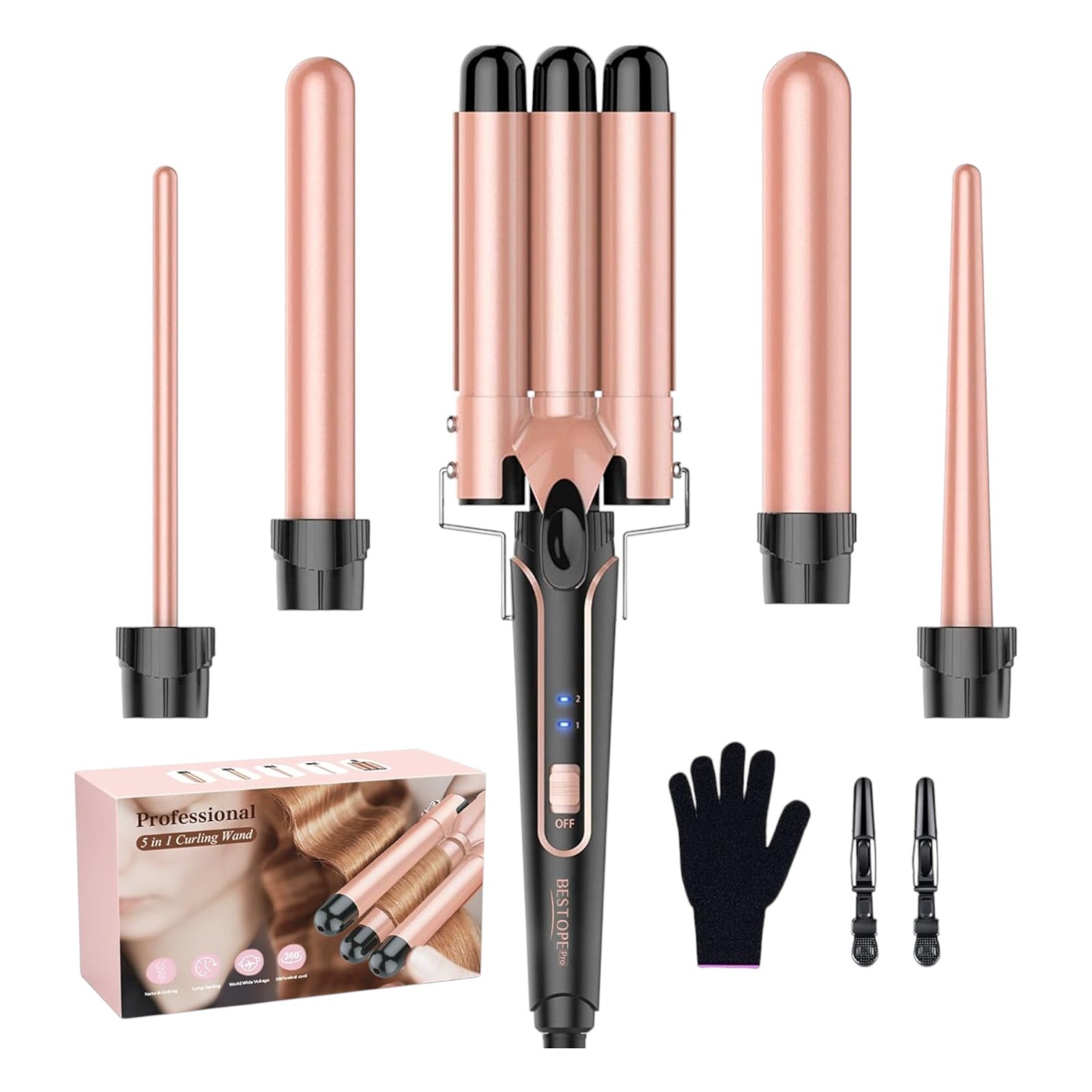 BESTOPE PRO 5 in 1 Beach Waver Hair Curler, Curling Iron (9-32mm) with 2 Temperature Control, Mermaid Hair Waver with Heat-Resistant Glove and 2 Clips for Long Medium Short Hair