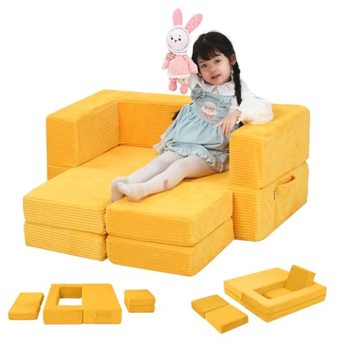 MeMoreCool Corduroy Kids Sofa Bed, Toddler Chair Couch, Kids Convertible Play Sofa Lounger Fold Out, Baby Couch Floor Armchair Chair Bedroom Furniture, Modular Mini Couch for Playroom, Yellow