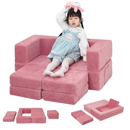 MeMoreCool Kids Play Sofa Bed, Modular Toddler Armchair Couch Chair for Bedroom Playroom, 8-Piece Fold Out Couch Play Set, Creative Baby Couch Children Convertible Sofa, Pink