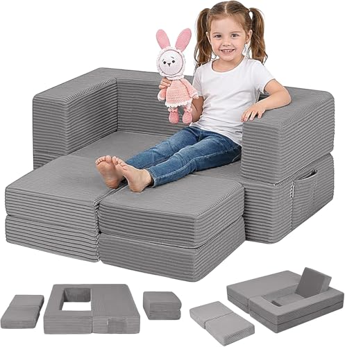 MeMoreCool Corduroy Kids Sofa Bed, Toddler Chair Couch, Kids Convertible Play Sofa Lounger Fold Out, Baby Couch Floor Armchair Chair Bedroom Furniture, Modular Mini Couch for Playroom, Grey
