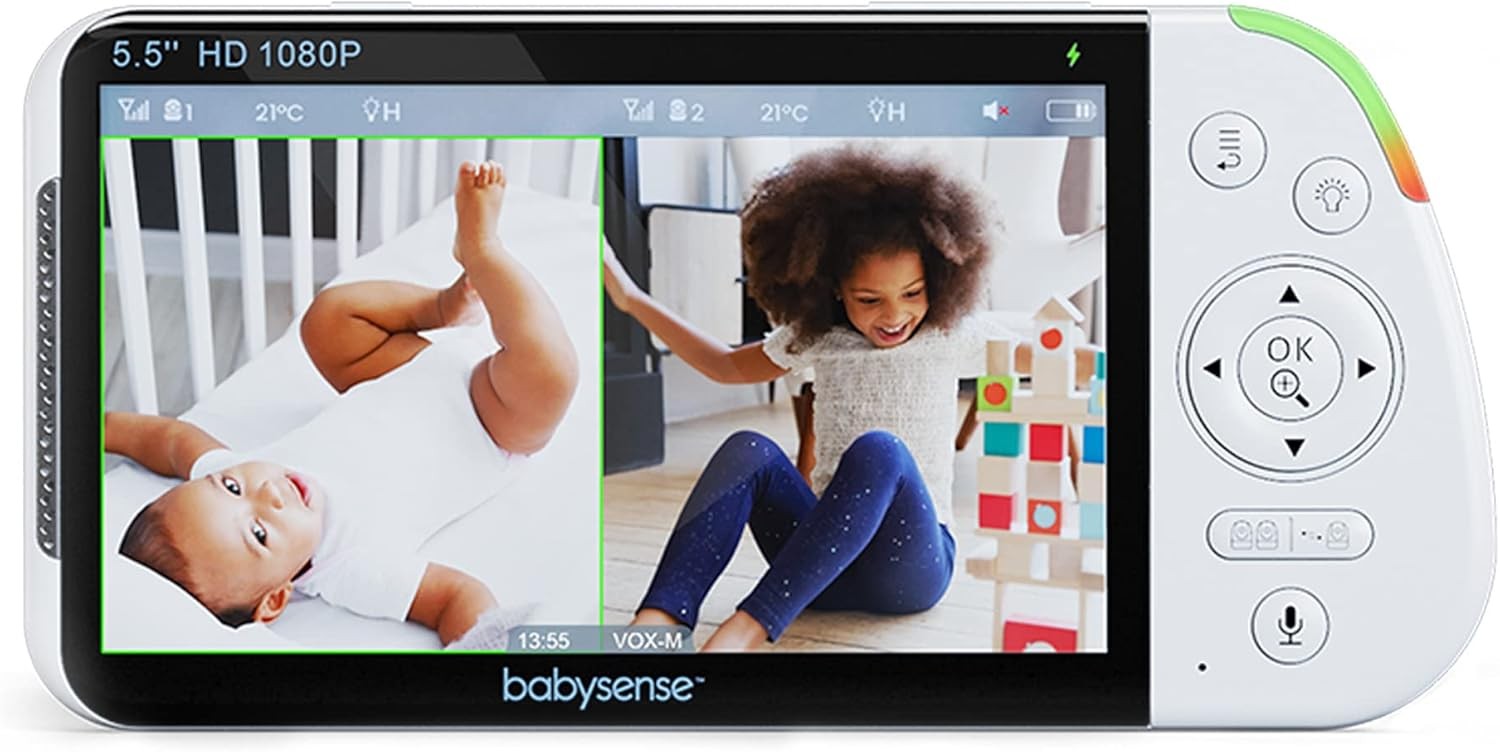 Babysense 5.5” 1080p Full HD Split-Screen Baby Monitor, Video Baby Monitor with Camera and Audio, Two PTZ Cameras, RGB Night Light, 300m Range, Two-Way Audio, 4x Zoom, 5000mAh Battery