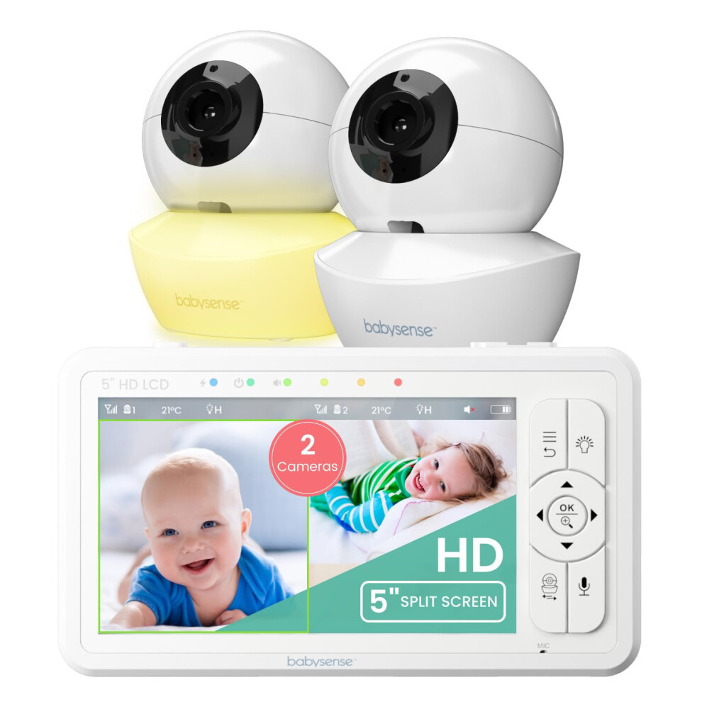Babysense Video Baby Monitor with 2 Cameras and Audio, 720p 5" HD Split-Screen, Adjustable Night Light, White Noise and Lullabies, Long Range, 4xZoom,