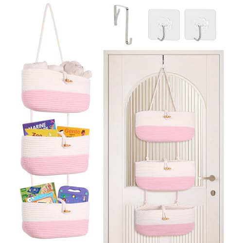 Autumnlife 3-Tier Over Door Storage Organiser, Woven Rope Hanging Door Organiser Wall Hanging Organiser Storage Cotton Fabric Back of Door Storage for Nursery, Bedroom, Bathroom - Pink