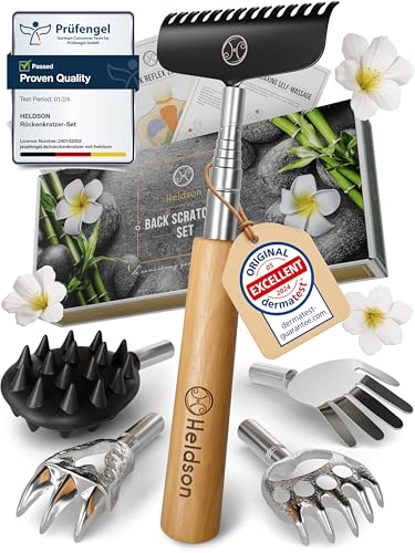 HELDSON® Extendable Back Scratcher [5 Scratching Heads] - Bear Claw Scratchers with Wooden Handle - Telescopic Backscratchers for Adults - Scalp Tickler Massage Tool - Gifts for Men, Women & Kids