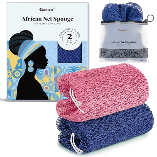 CORATED 2pcs African Exfoliating Net Sponge Set - Bath & Shower Net Sponges, Back Scrubber Washcloth for Shower, Beauty Skin Cleaning for Shower Spa Massage (Pink & Blue)
