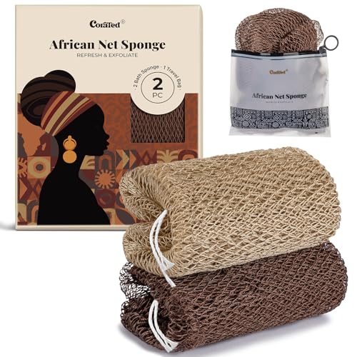 CORATED 2pcs African Exfoliating Net Sponge Set - Bath & Shower Net Sponges, Back Scrubber Washcloth for Shower, Beauty Skin Cleaning for Shower Spa Massage (Linen & Brown)