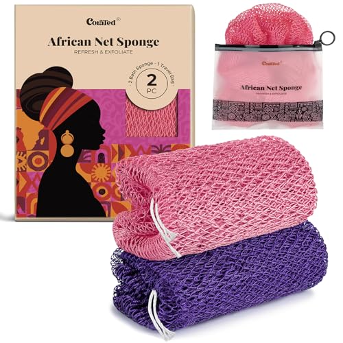 CORATED 2pcs African Exfoliating Net Sponge Set - Bath & Shower Net Sponges, Back Scrubber Washcloth for Shower, Beauty Skin Cleaning for Shower Spa Massage (Pink & Purple)