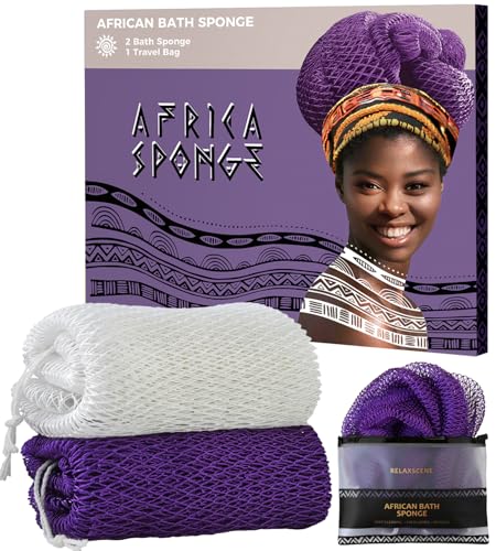 African Net Sponge Authentic - 2 Pieces Exfoliating Body Scrubber Bath Sponge - Back Scrubber Washcloth for Shower White&Purple - Real African Scrub Exfoliator Body Care Bathing Accessorie