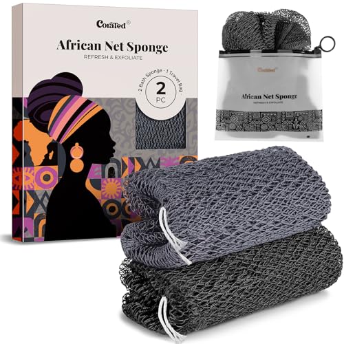 CORATED 2pcs African Exfoliating Net Sponge Set - Bath & Shower Net Sponges, Back Scrubber Washcloth for Shower, Beauty Skin Cleaning for Shower Spa Massage (Black & Grey)