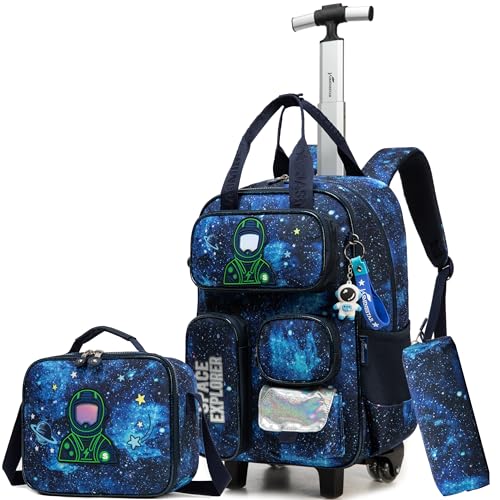 HTgroce Rolling Backpacks for Boy, Trolley School Bag with Lunch Bag Pencil Case for School,Trip Luggage,Suitcase, Rolling Backpack Set