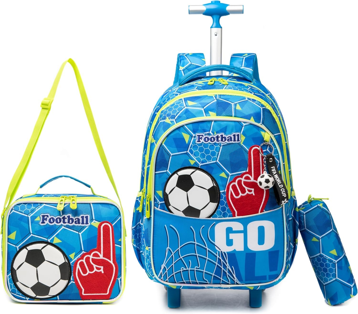 Egchescebo Kids Rolling Football Backpack for Boys 17" Trolley Suitcases Luggage Travel with Wheels Bookbag 3PCS Set Roller Backpacks Toddler Bag Back Pack School Bags Elementary Teenagers Blue